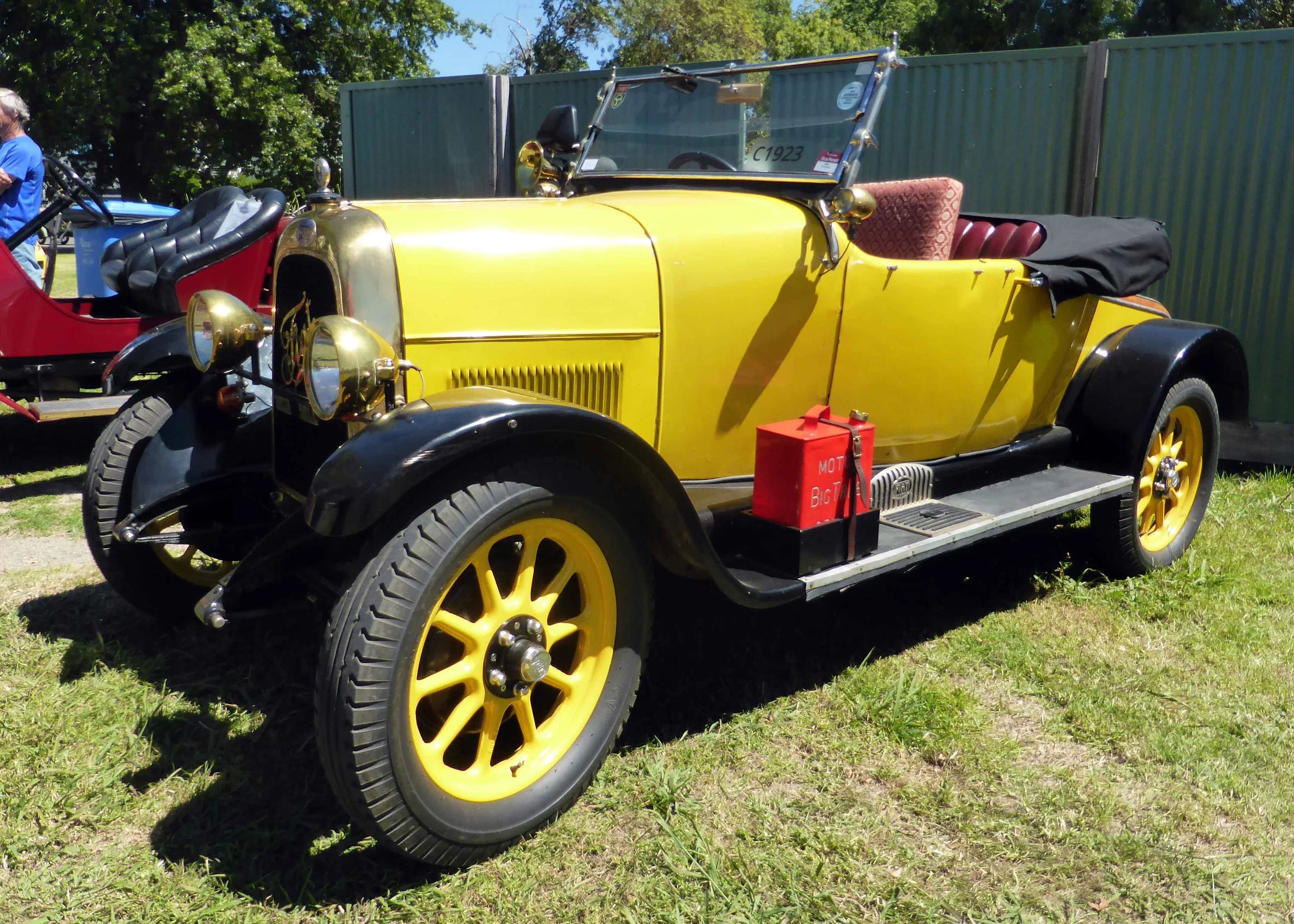A vintage yellow and black automobile with yellow wheels, parked on grass at an outdoor event. There is a red container on the side of the car labeled 'MOT BIG T' and a red carriage behind it.