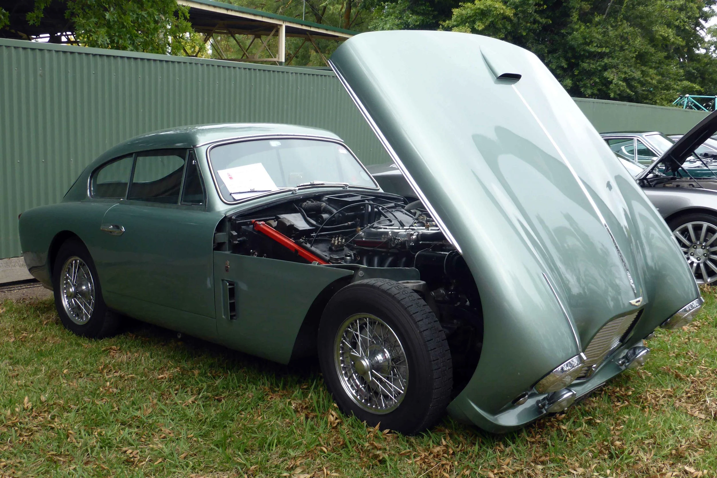 A vintage green sports car with its hood open, showing the engine, parked on grass at an outdoor exhibit. View fullsize