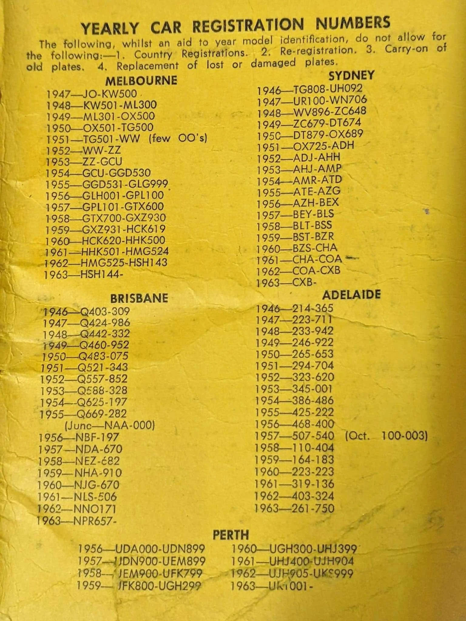 Note that the number ranges ranges and dates show below should not be taken as absolutely accurate as it is possible that small groups of numbers may have been issued to country Victoria districts and may have taken some considerable time to be used. Also in the 1920's & 30's it appears that it was common to reissue low digit numbers to new vehicles.