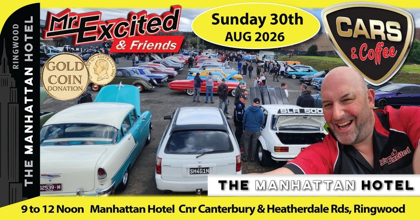 Back to All Events Cars & Coffee - Mr. Excited & Friends Sunday 30 August 2026 9:00 am 12:00 pm Manhattan Hotel Heatherdale Road Ringwood, VIC, 3134 Australia (map) Google Calendar ICS Facebook page
