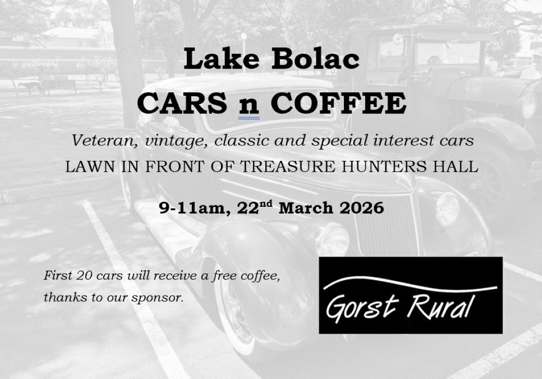 Back to All Events Lake Bolac Cars n Coffee Sunday 22 March 2026 9:00 am 11:00 am Treasure Hunters Hall 200 Montgomery Street Lake Bolac, VIC Australia (map) Google Calendar ICS
