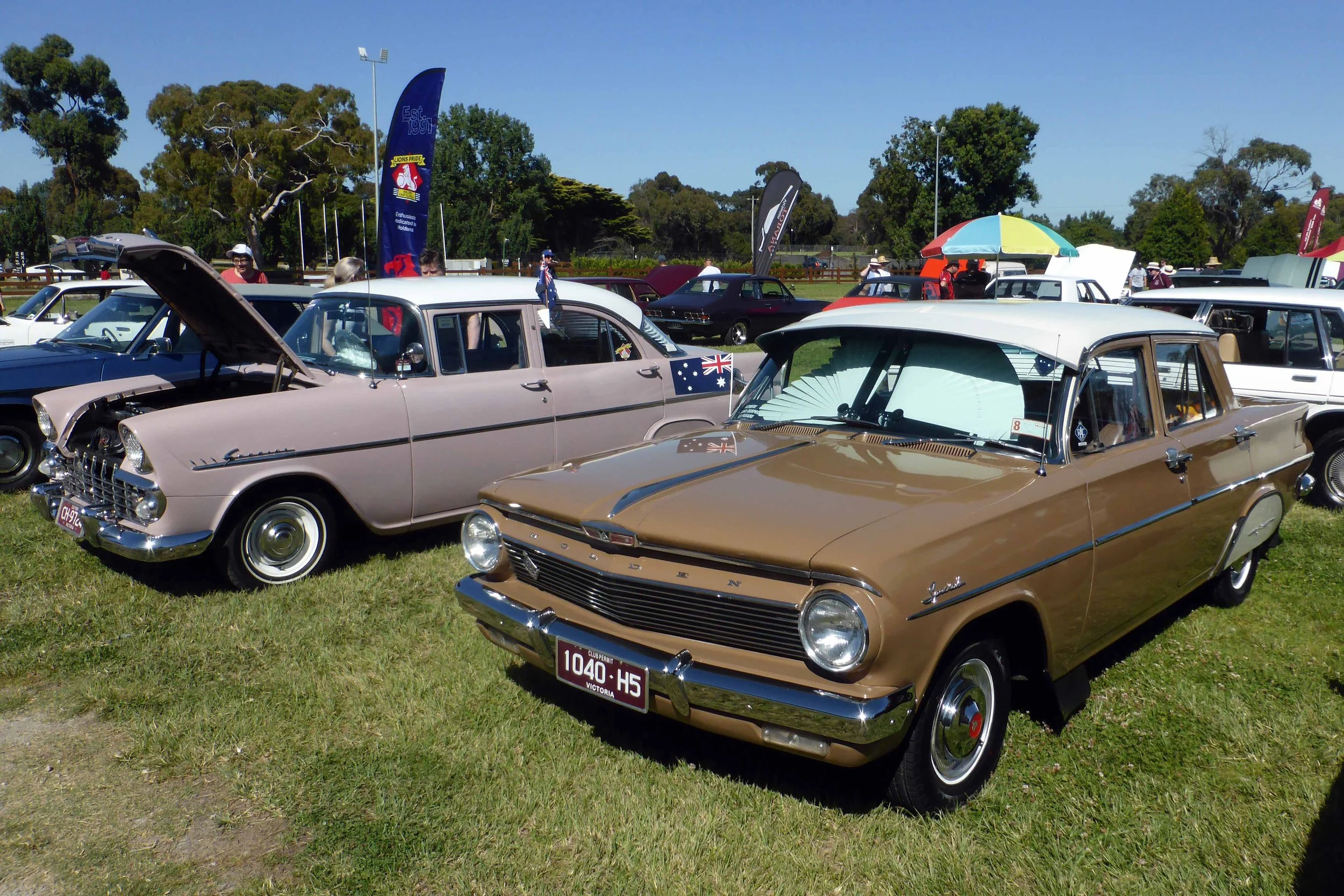 A vintage blue sedan with an Australian flag attached, parked on a grassy field during a car show, with several people and other classic cars in the background. View fullsize