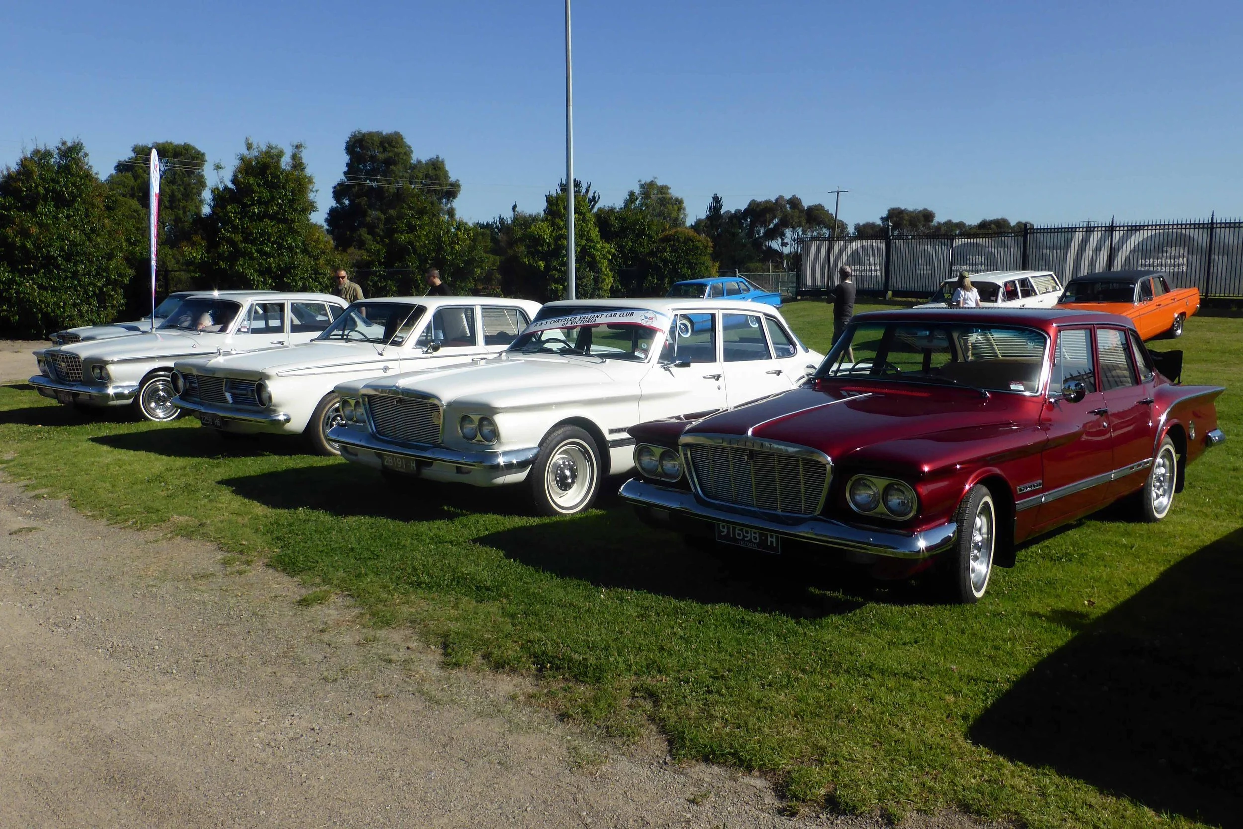 Several vintage cars parked on a grassy area at a car show, including white, red, orange, and blue classic models. View fullsize